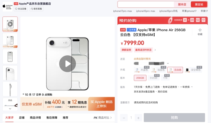 界面新闻注意到,京东平台上,Apple产品京东自营旗舰店内iPhone Air多个色系均处于无货状态,仅云白色iPhone Air 256GB版本支持预约抢购。